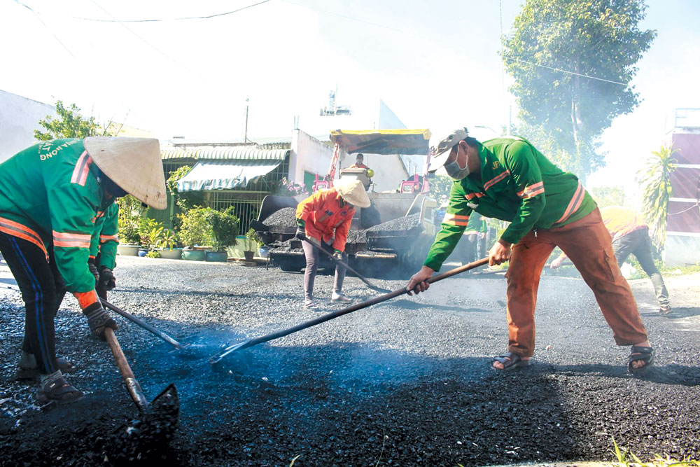 Công nhân thi công thảm nhựa công trình nâng cấp, mở rộng đường Nguyễn Thông, quận Bình Thủy.