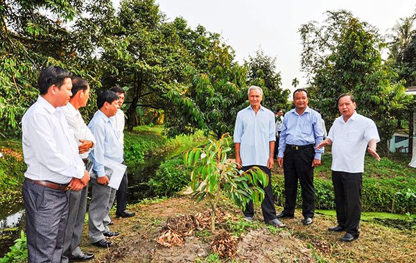 Đồng chí Trần Quốc Trung, Ủy viên Trung ương Đảng, Bí thư Thành ủy (bìa phải), tham quan mô hình trồng cây ăn trái ở xã Trường Thành.