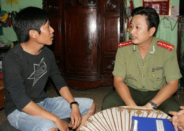 Đại úy Nguyễn Thanh Bình (bên phải), Bí thư Đoàn Thanh niên Công an TP Cần Thơ đến thăm hỏi, tìm hiểu hoàn cảnh gia đình một thanh niên chậm tiến do tuổi trẻ Công an thành phố nhận cảm hóa. Ảnh: Q. THÁ |