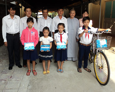 Sư cô Thích nữ Từ Tâm (hàng sau, thứ hai từ phải qua) cùng đại diện các ban ngành, đoàn thể quận Bình Thủy, phường Thới An Đông tặng học bổng, quà cho học sinh nghèo hiếu học tại địa phương. Ảnh: TÂM KHOA |