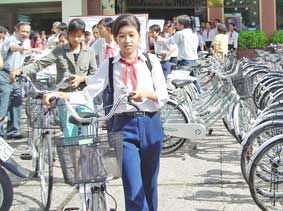 Các em học sinh có hoàn cảnh khó khăn trong niềm vui được tặng xe đạp. Ảnh: T.T. |