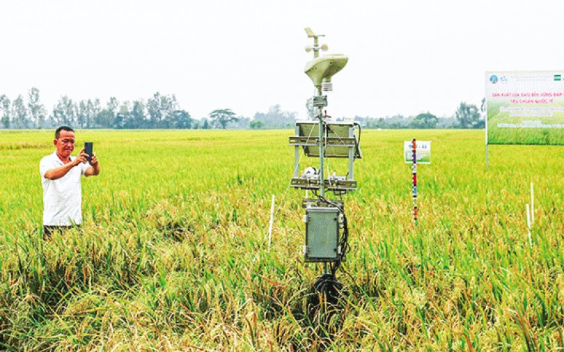 Thiết bị IoT được ngành Nông nghiệp TP Cần Thơ lắp đặt trên cánh đồng lúa ở xã Thạnh An, huyện Vĩnh Thạnh nhằm quan trắc tự động môi trường và theo dõi tình hình phát triển của lúa. (ảnh chụp trước khi dịch COVID-19 diễn ra).