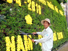 Công nhân Công ty TNHH một thành viên Công trình đô thị đang chỉnh sửa các bảng hoa chào đón năm mới. |