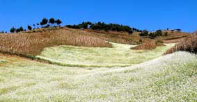 Mỗi mùa trong năm, Mộc Châu lại có một nét đẹp riêng. Đồi núi thênh thang. Những cánh đồng hoa cải trắng trải dài đến ngút ngàn. Mùa hoa mận, hoa đào nở, vùng đất này như chìm trong muôn sắc hoa. Cứ vào dịp cuối tuần, các bạn trẻ Hà thành lại rủ nhau lên Mộc Châu ngoạn cảnh. Chỉ vài giờ ngồi xe khách hay xe máy, trước mắt du khách là thiên nhiên rộng mở với những đồi núi nhấp nhô. Những cánh đồng cỏ, nương chè xanh mượt xen lẫn những vạt hoa trắng muốt kéo dài đến tận chân trời.