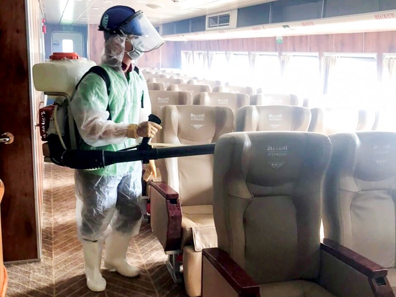 Nhân viên Công ty TNHH Dịch vụ vệ sinh Gia Nguyễn phun xịt khử trùng các xe khách của Công ty CP Tập đoàn Mai Linh.