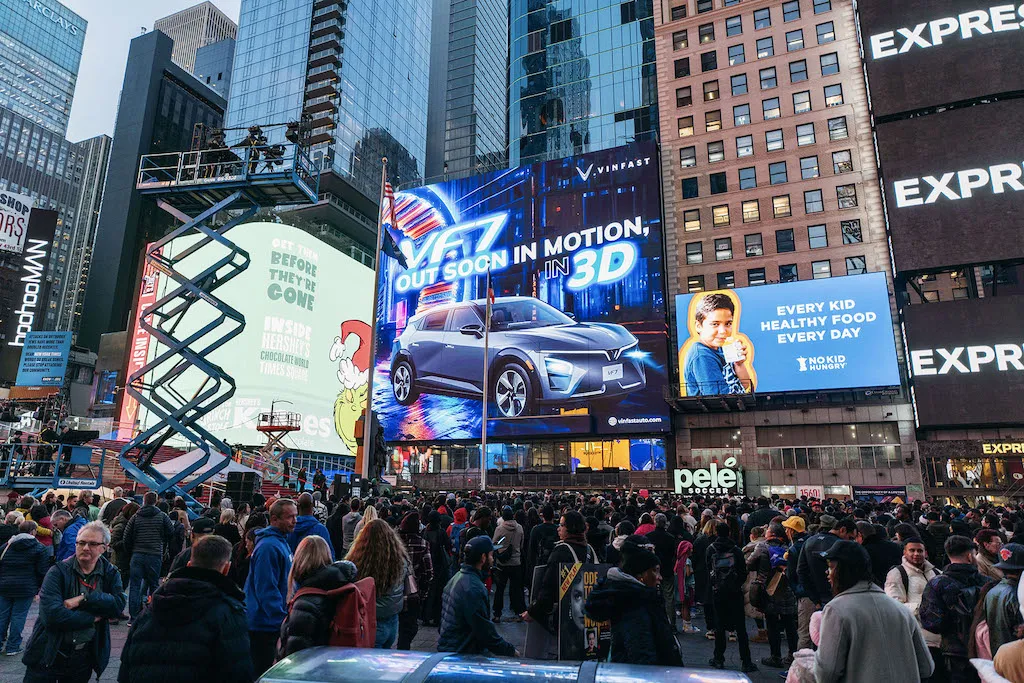 Màn xuất hiện của VF 7 tại quảng trường Thời Đại thu hút sự chú ý của hàng ngàn du khách quốc tế