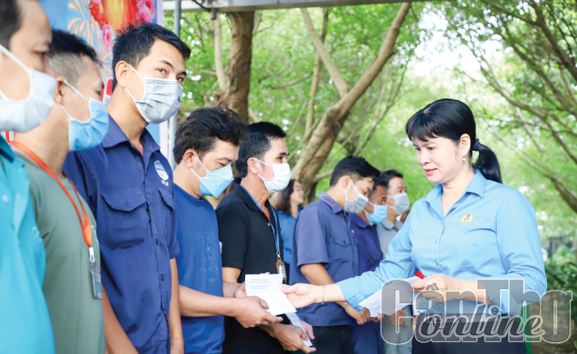 Bà Phạm Kim Tuyến, Chủ tịch LĐLĐ quận Thốt Nốt tặng quà ĐV, NLĐ có hoàn cảnh khó khăn tại Công ty CP Thủy sản NTSF.