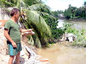 Biến đổi khí hậu tác động dòng chảy, gây sạt lở bờ sông. Trong ảnh bờ sông Trà Nóc, phường Trà An, quận Bình Thủy bị sạt lở vào ngày 1-5-2012, ảnh hưởng đời sống, sinh hoạt của người dân. |