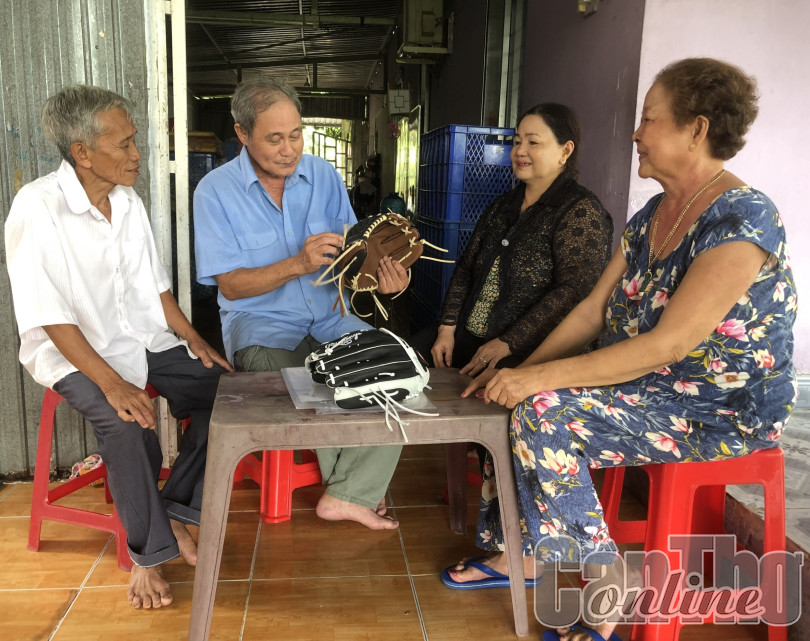 Cán bộ Ban Công tác Mặt trận khu vực Thới Hòa C tìm hiểu tình hình đời sống, sản xuất của thành viên mô hình may gia công găng tay.