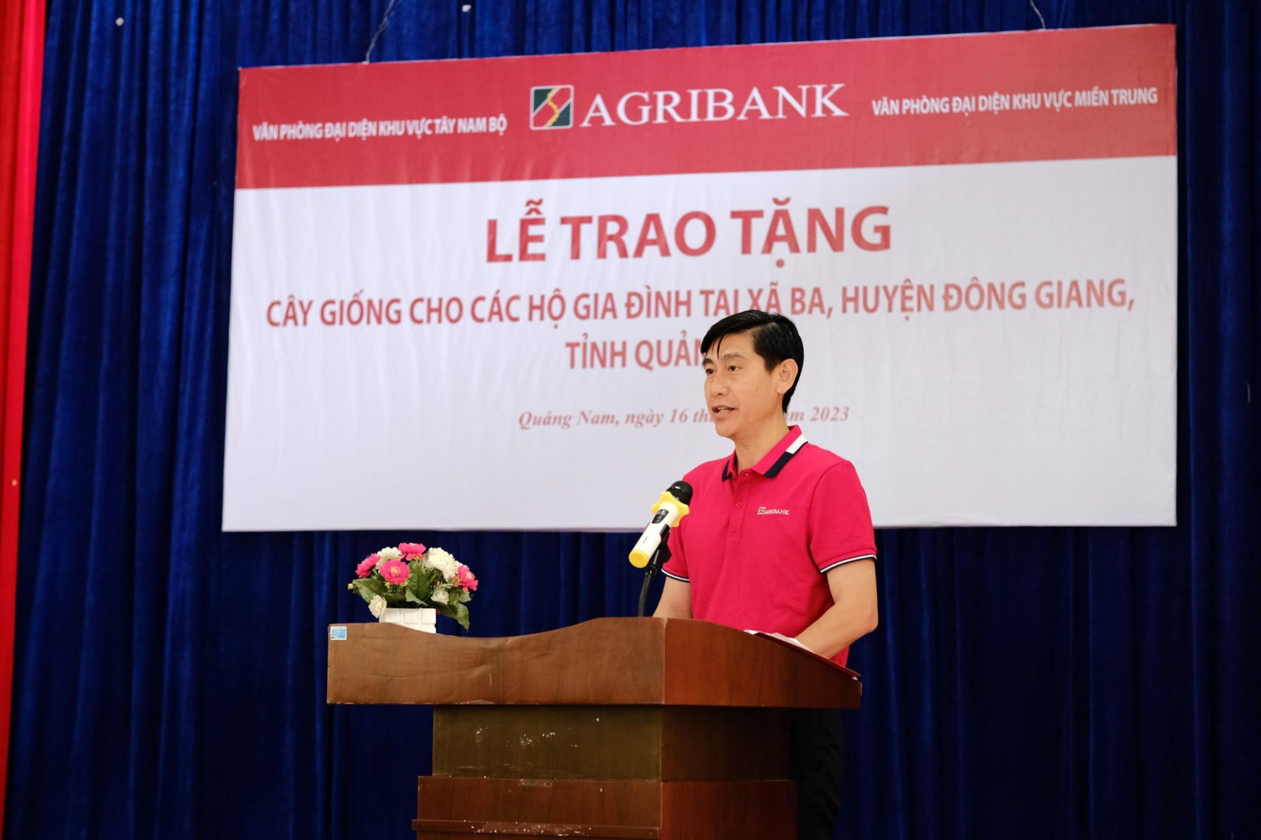 Phát biểu tại buổi lễ, ông Phan Văn Bá, Phó trưởng Văn phòng đại diện Agribank khu vực Tây Nam Bộ, nhấn mạnh, thông qua chương trình, tuổi trẻ Agribank phát huy truyền thống đoàn kết, tương thân, tương ái "lá lành đùm lá rách", tình nguyện đóng góp kinh phí trao tặng cây giống cho bà con tại xã Ba, huyện Đông Giang, tỉnh Quảng Nam. Với tinh thần luôn hướng về đồng bào miền Trung ruột thịt, Văn phòng dại diện Tây Nam Bộ, tuổi trẻ Agribank khu vực Tây Nam Bộ hy vọng sẽ góp phần để người dân trên địa bàn xã Ba tạo sinh kế, đa dạng giống cây trồng, tiếp thêm nghị lực để bà con phấn đấu làm ăn, vượt qua khó khăn, vươn lên trong cuộc sống.