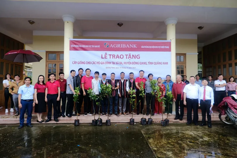 (CTO) - Ngày 16-11, Văn phòng đại diện (VPĐD) Agribank khu vực Tây Nam Bộ, VPĐD Agribank khu vực Miền Trung phối hợp cùng UBND xã Ba, huyện Đông Giang, tỉnh Quảng Nam trao tặng cây giống cho hộ dân trên địa bàn để chuyển đổi sinh kế với tổng số tiền 120 triệu đồng. Trong đó, Đoàn Thanh niên Agribank khu vực Tây Nam Bộ ủng hộ 100 triệu đồng, Văn phòng Đại diện Miền Trung ủng hộ 20 triệu đồng.