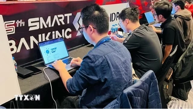 Các kỹ sư công nghệ tham gia diễn tập an ninh mạng lĩnh vực tài chính, ngân hàng. (Ảnh: Ngọc Bích/TTXVN)