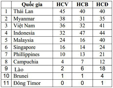 Bảng tổng sắp huy chương tính đến 20g00 ngày 15-12