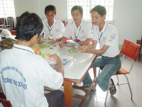 Phạm Hoài Hận, năm thứ 2 ngành Luật Thương mại, cũng có những “tai nạn” nhớ đời khi mang công cụ là mô hình cơ quan sinh dục nam và BCS lân la trò chuyện với các bạn nam về cách quan hệ tình dục an toàn để tránh lây bệnh. Có bạn cũng lịch sự lắm, hợp tác vui vẻ, còn chỉ thêm kinh nghiệm, nhưng cũng có người lạnh lùng ném những tờ bướm xuống đất, đuổi đi. “Nếu không tỉnh táo, bản lĩnh và thật sự yêu công việc thì khó lòng trụ vững. Gặp sự cố thì tự động viên mình, quá lắm thì tâm sự với đồng nghiệp rồi cho qua. Nhưng phần lớn đa số khách hàng được tư vấn xong đều cảm ơn. Nhờ có những niềm vui như thế mà tinh thần các bạn phấn chấn làm tiếp, quên hết những trục trặc trong nghề” - Hận nói. Gặp những “ca” khó, các bạn khéo léo “chuyển tuyến” bằng cách giới thiệu khách hàng lại những trung tâm tư vấn... Sau mỗi buổi đi thực tế, cả nhóm ngồi lại chia sẻ, rút kinh nghiệm rồi về viết báo cáo. Dù vất vả nhưng bạn nào cũng vui vì thấy được ý nghĩa công việc mình làm.