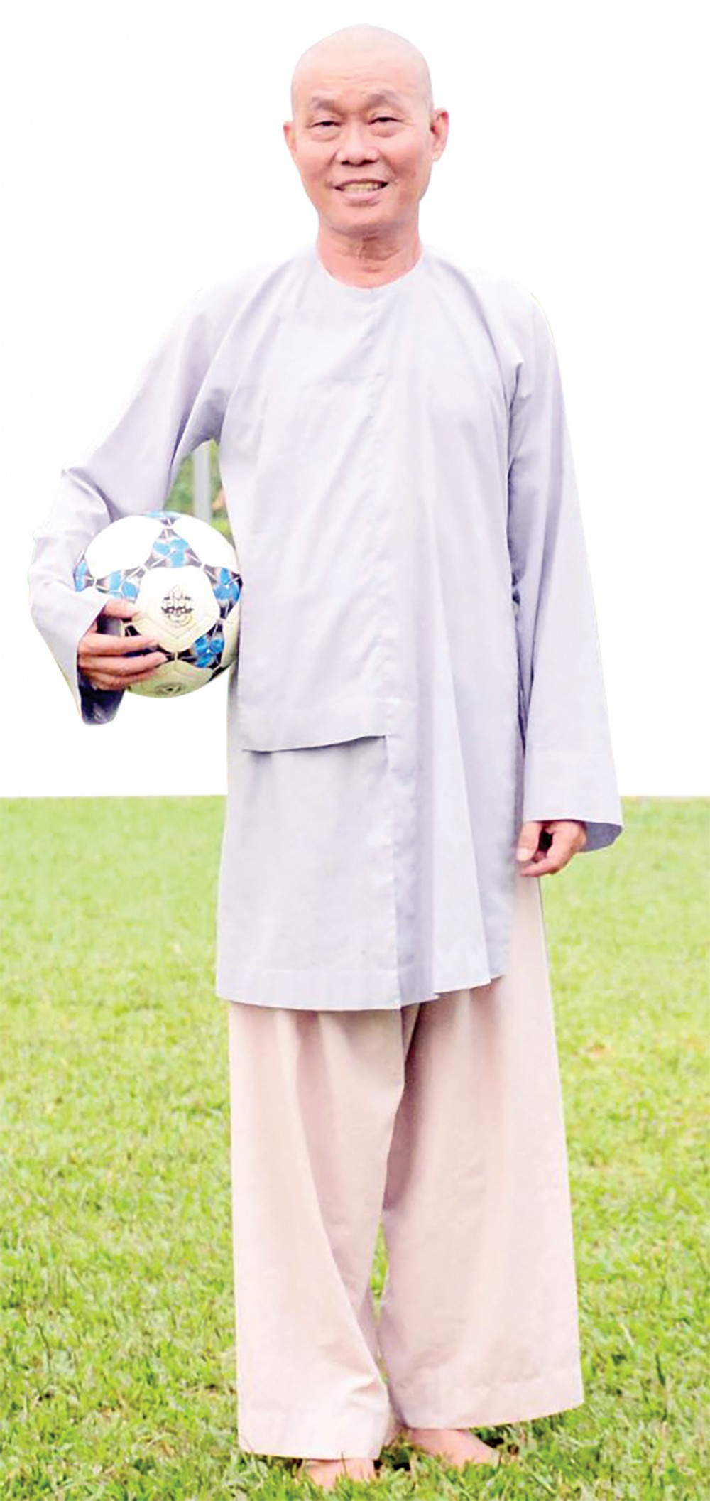 Đại đức Thích Minh Hào trên sân bóng đá trong khuôn viên chùa Hội Long. Ảnh: Tuấn Trần