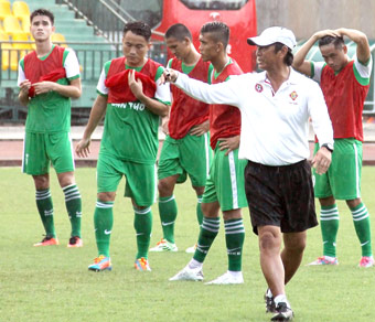HLV Vũ Quang Bảo chỉ đạo các cầu thủ Cần Thơ tập luyện tích cực trên sân Cần Thơ. Ảnh: Nguyễn Minh |