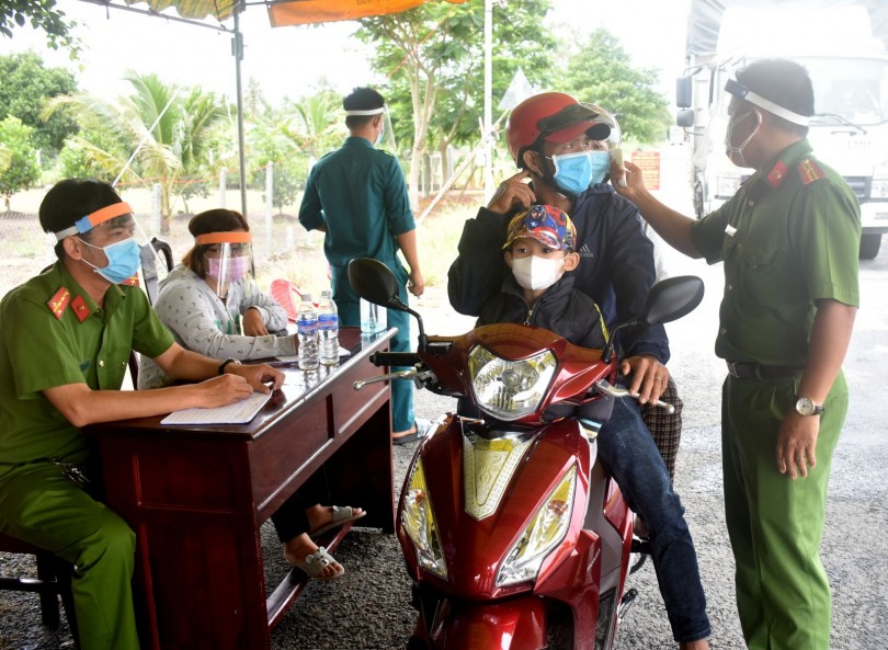 Công an xã Trường Xuân, huyện Thới Lai, đo thân nhiệt người tham gia giao thông từ nơi khác ngang qua địa bàn huyện.