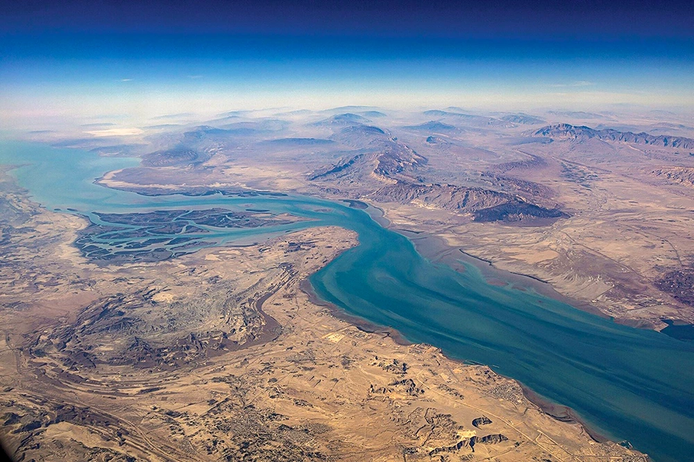 Eo biển Hormuz nhìn từ trên cao. Ảnh: Reuters