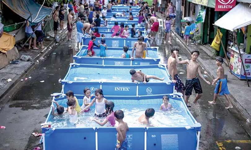 Trẻ em chơi trong bể bơi di động trong dự án chống nóng của chính quyền ở thủ đô Manila, Philippines.
