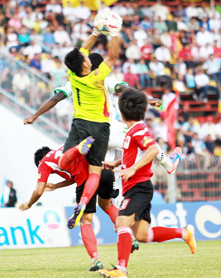 Chiều 16-2 sẽ là ngày làm việc vất vả của thủ môn Tiến Phong (số 1 - Đồng Tâm Long An). Ảnh: MINH THẢO