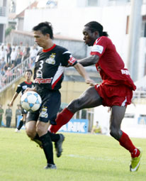 Đội trưởng Phan Văn Giàu (trái) dìu dắt đồng đội ĐTLA trở lại V-League. |