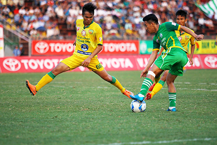Quang Tình đi bóng qua 2 cầu thủ Đồng Tháp.