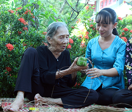 Các nghệ nhân hướng dẫn các bạn trẻ cách làm bánh truyền thống tại Lễ Kỳ yên Thượng điền Đình Bình Thủy năm 2016.