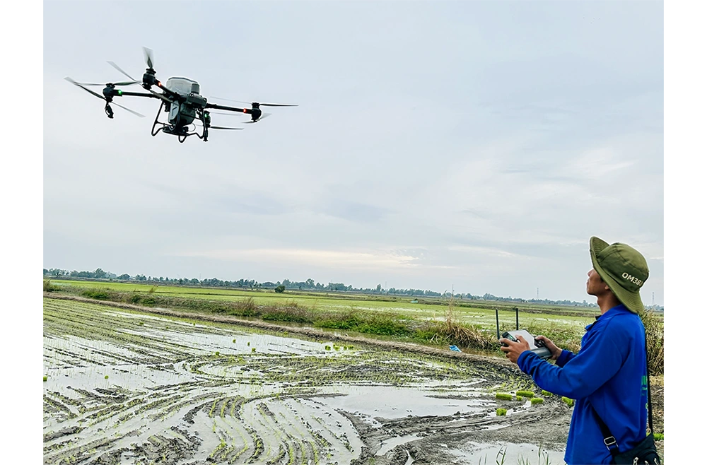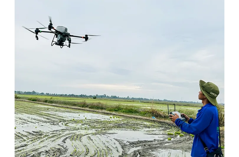 Ứng dụng máy bay không người lái trong sản xuất lúa tại Viện Lúa ĐBSCL. Ảnh: MỸ THANH