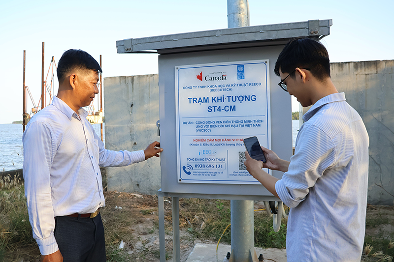 Ban Quản lý rừng phòng hộ ven biển TP Cần Thơ kiểm tra một trạm khí tượng thủy văn cảnh báo sớm đặt tại Cảng cá Mó Ó, xã Trần Đề, TP Cần Thơ. Ảnh: MINH HUYỀN