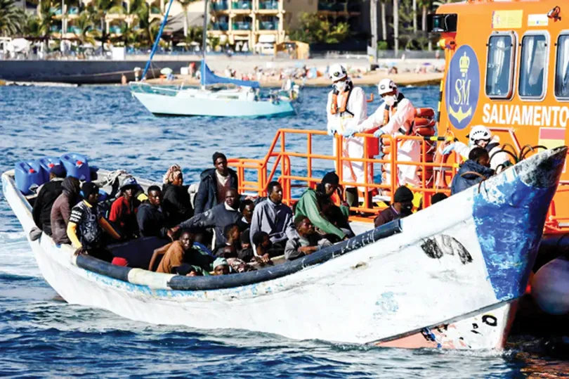 Tàu tuần duyên Tây Ban Nha lai dắt một thuyền chở người di cư đến đảo Gran Canaria. Ảnh: Reuters