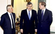 Thủ tướng Anh Gordon Brown (giữa) gặp Chủ tịch Ngân hàng Thế giới Robert Zoellick (phải) hôm 13-3 trước khi cuộc gặp của các bộ trưởng G20 diễn ra tại Luân Đôn.