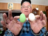 Chủ một trại nuôi gia cầm ở Croatia hết sức ngạc nhiên khi tận mắt chứng kiến con gà mái Fata của mình đẻ trứng màu xanh lá cây (ảnh). Ông Stipa Gregacevic thật sự không thể giải thích hiện tượng kỳ lạ này trong khi một số người cho rằng có thể là do ông trộn ớt đỏ vào thức ăn của gà (?!). Stipa cho biết nhiều khách hàng sẵn lòng mua trứng gà xanh với giá cao gấp đôi so với trứng gà thường.