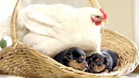 Gà mái Mabel trong một nông trại ở Shropshire (Anh) đã khiến chủ nuôi hết sức ngạc nhiên, khi ấp ủ một bầy chó mới sinh dưới cánh của mình (ảnh). Trước đó, gà ta canh me chó mẹ vừa đi khỏi là lập tức nhảy vào ổ chó con và âu yếm sưởi ấm chúng. Báo hại, suốt tuần qua, chó mẹ phải nằm thui thủi ngoài sân giá lạnh vì vị trí của mình đã bị “mẹ nuôi” thay thế. Chủ nhân của Mabel hy vọng con gà mái 1 năm tuổi này sớm có gà con để thỏa sức thể hiện tình mẫu tử.