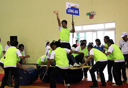 Các VĐV đơn vị Bảo Việt Long An tranh tài nội dung chèo thuyền trên thùng phuy.