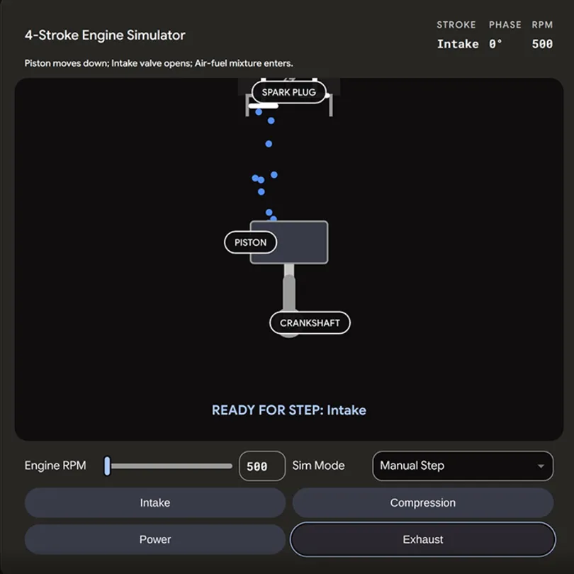 Điển hình là khi yêu cầu Gemini mô tả cách Mặt Trăng quay quanh Trái Đất, AI không chỉ vẽ một bức tranh mà còn cung cấp một mô phỏng tương tác. Tại đây, người dùng có thể sử dụng thanh trượt để điều chỉnh tốc độ quỹ đạo hay tinh chỉnh góc nhìn theo ý muốn. Tương tự đối với việc tìm hiểu nguyên lý hoạt động của động cơ ô tô, bạn có thể chọn phát toàn bộ ảnh động của động cơ hoặc tự điều chỉnh thủ công để quan sát chi tiết từng bước trong quy trình vận hành.