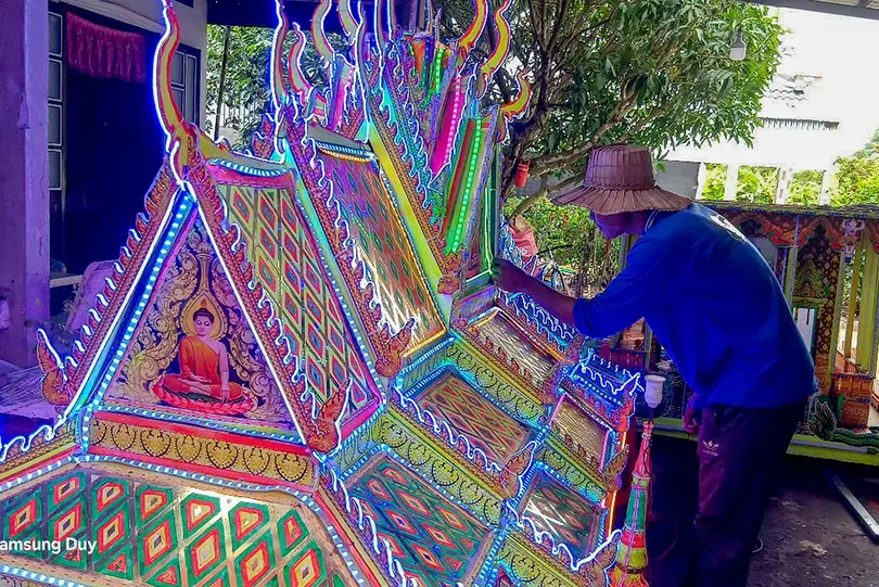 Những đôi tay khéo léo cẩn thận tô từng nét hoa văn, uốn từng sợi dây điện, gắn từng bóng đèn quanh thân ghe và hình tượng trên ghe. Mỗi chi tiết đều gửi gắm niềm tự hào, lòng thành kính và tình yêu văn hóa dân tộc.