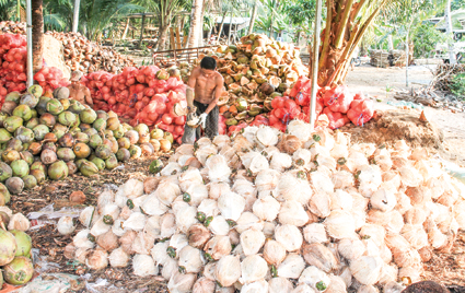 Bóc tách vỏ dừa tại một cơ sở sản xuất kinh doanh dừa ở huyện Mỏ Cày Bắc, tỉnh Bến Tre.