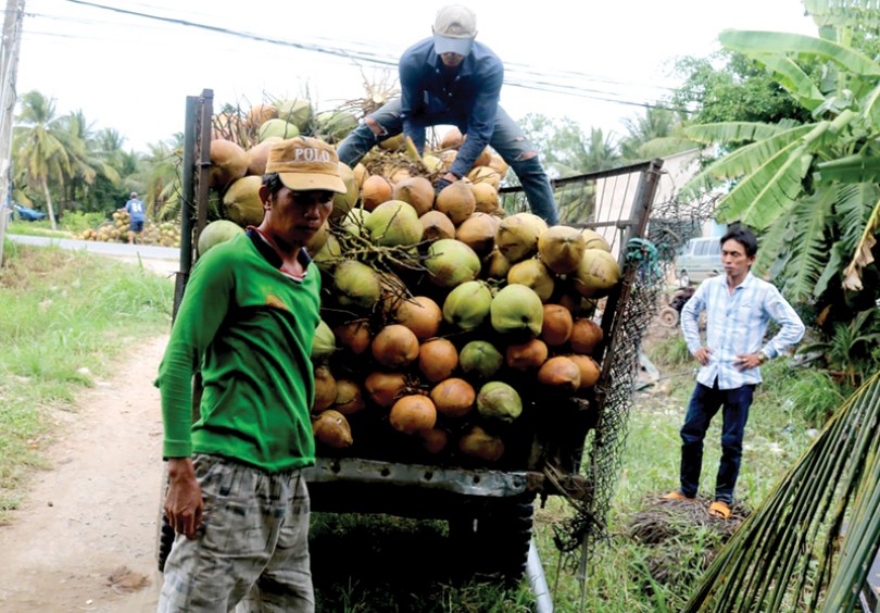 Thương lái thu mua dừa của nông dân ở huyện Giồng Trôm, tỉnh Bến Tre.