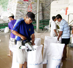 Đóng bao gạo xuất khẩu tại Công ty TNHH Gạo Việt thuộc Công ty cổ phần Gentraco ở quận Thốt Nốt, TP Cần Thơ. Ảnh: KHÁNH TRUNG |