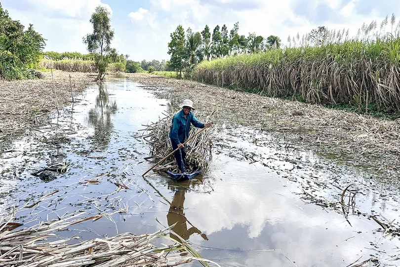 Giữa trưa nắng, trên các cánh đồng mía thuộc các ấp của xã Long Hưng, nhiều hộ dân vẫn cặm cụi đốn mía. Những chiếc xuồng nhỏ chòng chành chở đầy mía, nông dân thì gồng mình chống xuồng đưa mía ra bờ...