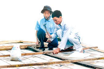 Anh Lê Văn Loan (phải) đang dựng nhà cho chị Nguyễn Thị Nâu. Ảnh: TƯỜNG VI |