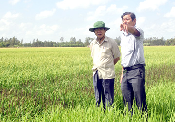 Kỹ sư Hồ Quang Cua (phải) trao đổi cùng Phó Chủ tịch Lê Thành Trí về tình hình sản xuất lúa ST20 ở Ngã Năm. |