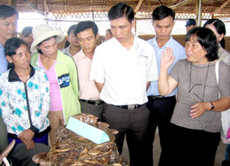Tiến sĩ Nguyễn Thị Xuân Thu (bìa, phải) giới thiệu nấm được trồng trên giá thể là lục bình. Ảnh: NHẬT CHÁNH |