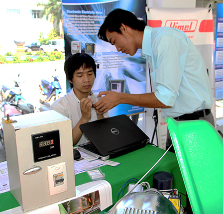 Khách hàng tham quan, tìm hiểu các thiết bị TKĐ được trưng bày trong cửa hàng trưng bày giới thiệu sản phẩm tiết kiệm điện.