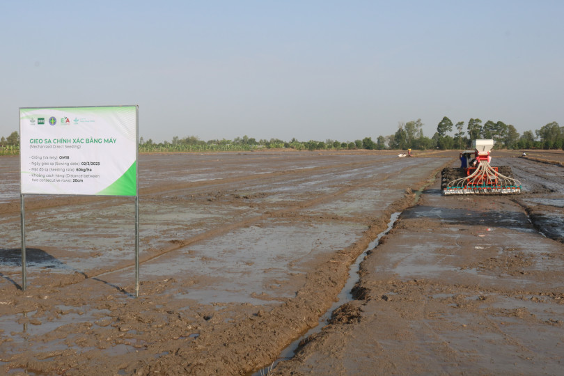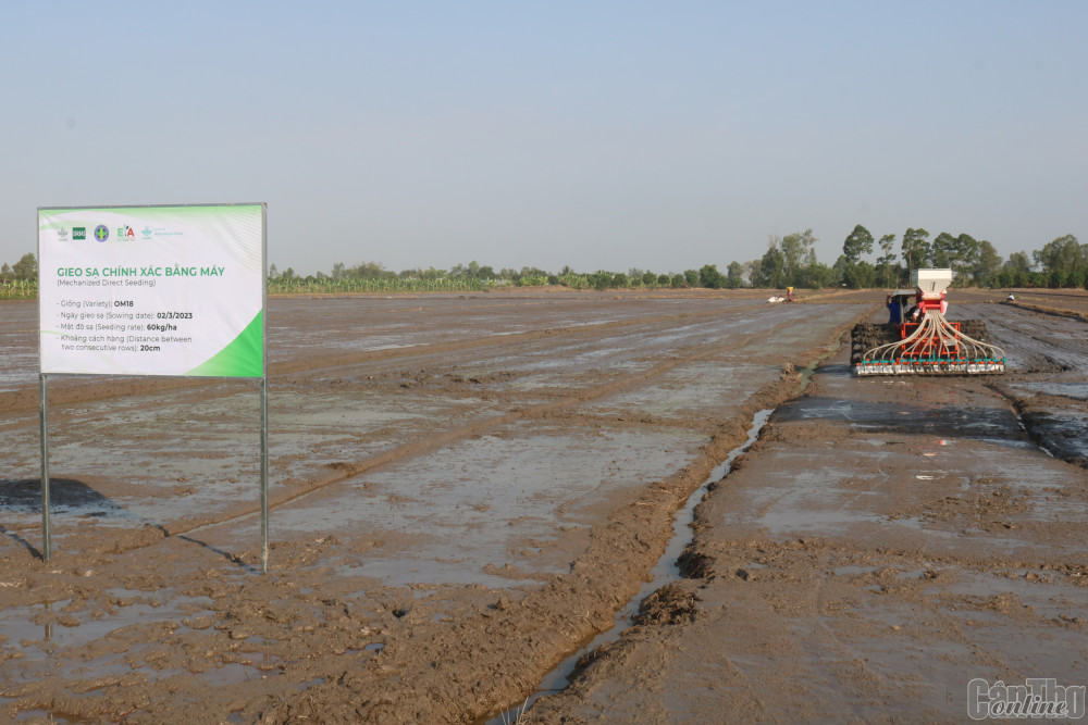 Ruộng lúa của nông dân được chọn trình diễn có tổng diện tích 5ha, được thực hiện theo 3 nghiệm thức gieo sạ khác nhau đối với giống lúa OM 18 trong vụ lúa hè thu 2023 để cuối vụ có sự so sánh về hiệu quả trong áp dụng cơ giới hóa để giảm lượng giống và các lợi ích về kinh tế, xã hội, môi trường. Cụ thể, có 2ha được gieo sạ chính xác bằng máy APV với mật độ sạ 60kg/ha và khoảng cách hàng là 20cm; 2ha được gieo sạ với khoảng cách hàng 25cm; còn lại 1ha được gieo sạ với mật độ 120 kg/ha bằng máy phun hạt. Nông dân được hỗ trợ chi phí thực hiện gieo sạ lúa bằng máy và được hỗ trợ một số loại vật tư đầu vào.