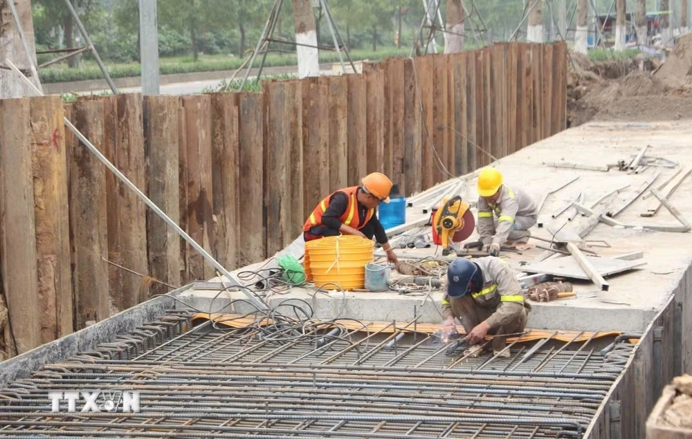 Công nhân thi công "3 ca, 4 kíp" để kịp đưa công trình chống ngập của Hà Nội hoàn thành trước mùa mưa năm 2026. (Ảnh: Nguyễn Thắng/TTXVN)