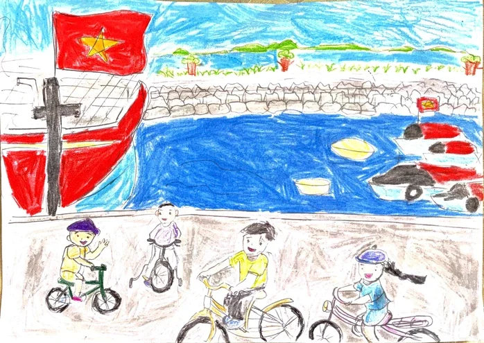 Tôi đi chậm một vòng quanh lớp. Đến chỗ Đạt, bước chân bỗng khựng lại. Em vẽ cảnh trẻ em đạp xe ra âu cảng, phía xa là những con tàu neo đậu. Em dồn lực, tì mạnh bút sáp đỏ để tô thật đậm lá cờ trên nóc tàu cá. Đạt khoe: "Em phải tô đỏ thật tươi thế này thì sóng to gió lớn mới không làm phai được, thầy ạ".