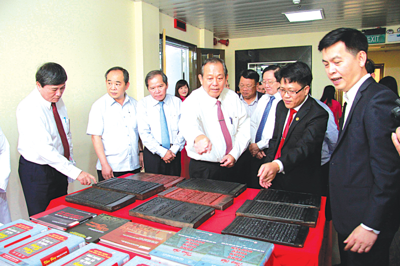 Phó Thủ tướng Trương Hòa Bình đến thăm các khu trưng bày, phòng bảo quản và phục hồi tài liệu mộc bản. Ảnh: ĐẶNG TUẤN (TTXVN)
