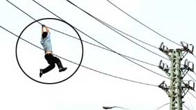 Xiang Jun ở thành phố Đông Quan (Quảng Đông, Trung Quốc) đã khiến nhiều người đi đường sởn gai ốc khi chứng kiến anh đu người trên đường điện cao thế 4 giờ liền trước khi “hạ màn” bằng pha nhảy xuống tấm nệm hơi khổng lồ.