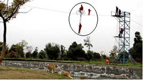 Một sở thú ở Trung Quốc vừa bị chỉ trích kịch liệt vì để một bé gái biểu diễn trò giữ thăng bằng trên dây ngay trong khu vực đang nuôi nhốt một bầy cọp Sibérie hung dữ.